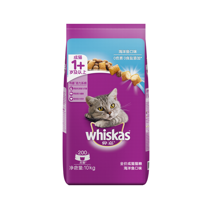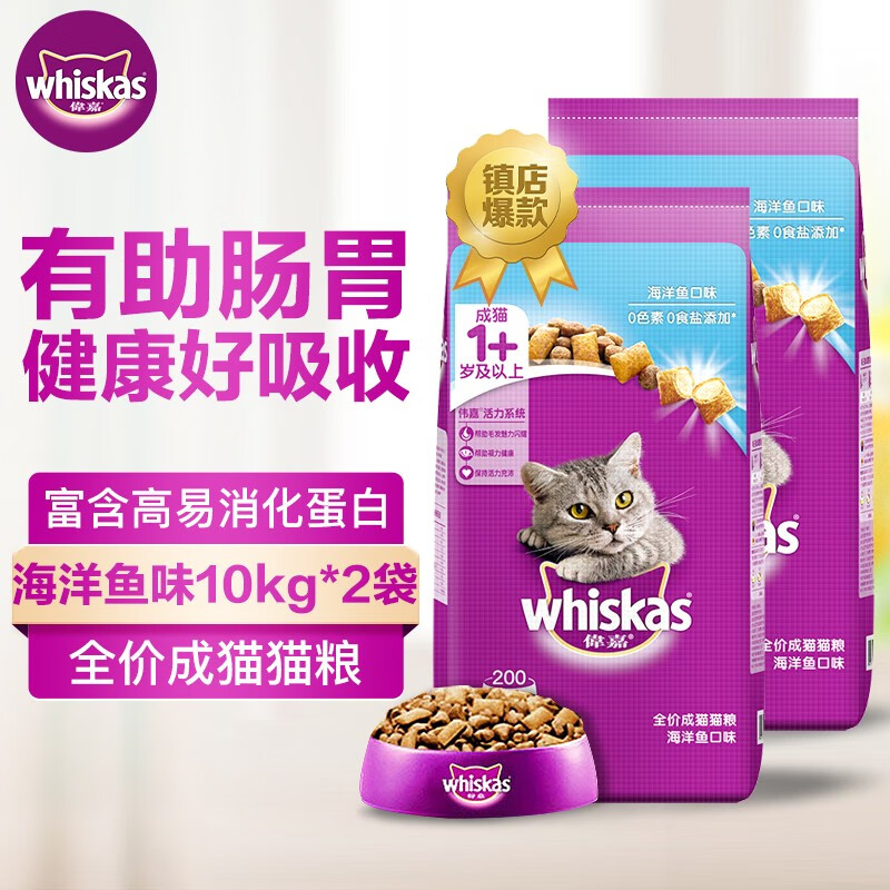 伟嘉(whiskas) 猫粮成猫布偶蓝猫橘猫加菲英短全价粮 海洋鱼味10kg*2袋