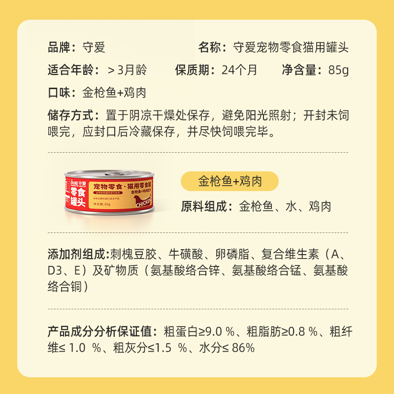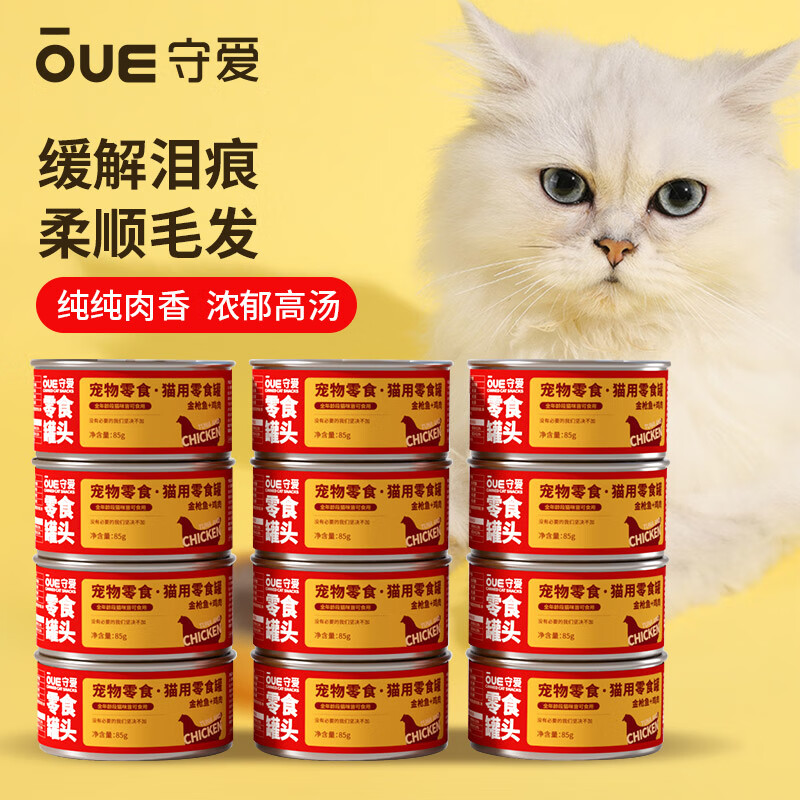 守爱元气红肉猫罐头猫粮猫湿粮宠物零食猫用浓汤金枪鱼鸡肉口味罐头 85g*12罐/箱