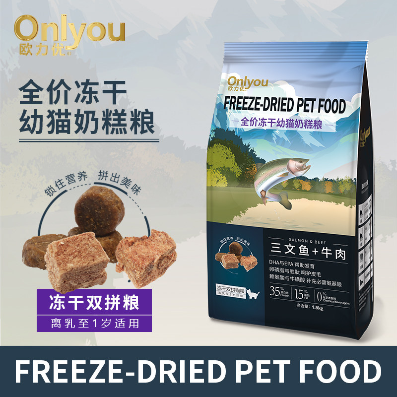 欧力优冻干幼猫奶糕粮1.5kg全价猫咪营养增肥发腮猫粮三文鱼牛肉