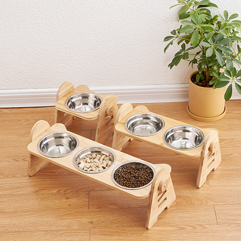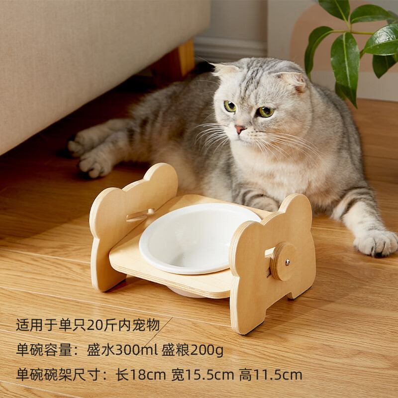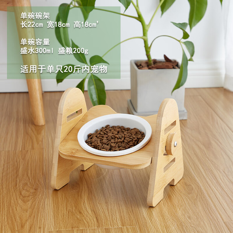 华元宠具烁坭猫碗陶瓷双碗斜口保护颈椎猫食盆防打翻宠物狗碗可调节竹木架 竹架单碗整套