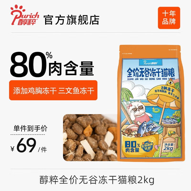 醇粹(Purich)FD猫粮 全价冻干猫粮幼猫成猫纯粹猫粮英短美短布偶折耳鸡肉猫粮 双拼冻干粮2kg(新品)