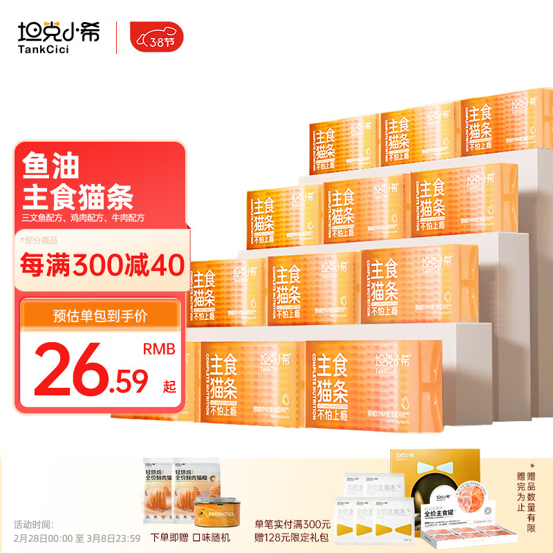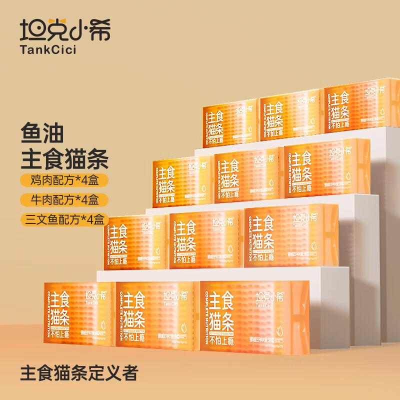 坦克小希(Tankcici)主食猫条补充营养无胶质无诱食剂鱼油全价幼年成年猫条湿粮12盒 超纯鱼油鸡肉牛肉三文鱼各4盒