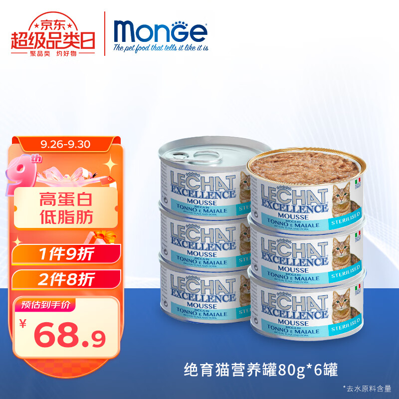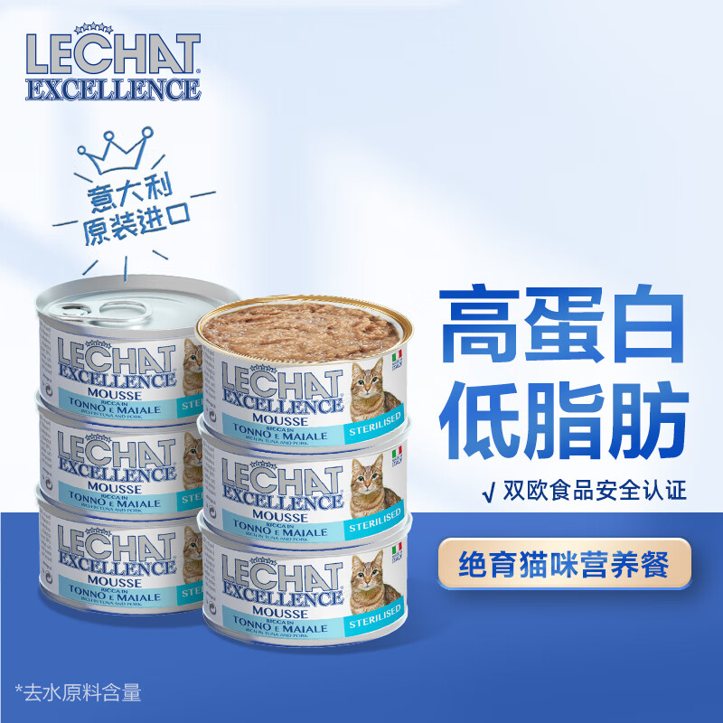 孟爵 爱优乐莎喵(MONGE LECHAT EXCELLENCE)意大利原装进口预防肥胖绝育猫慕斯罐金枪鱼 猪肉85g*6罐