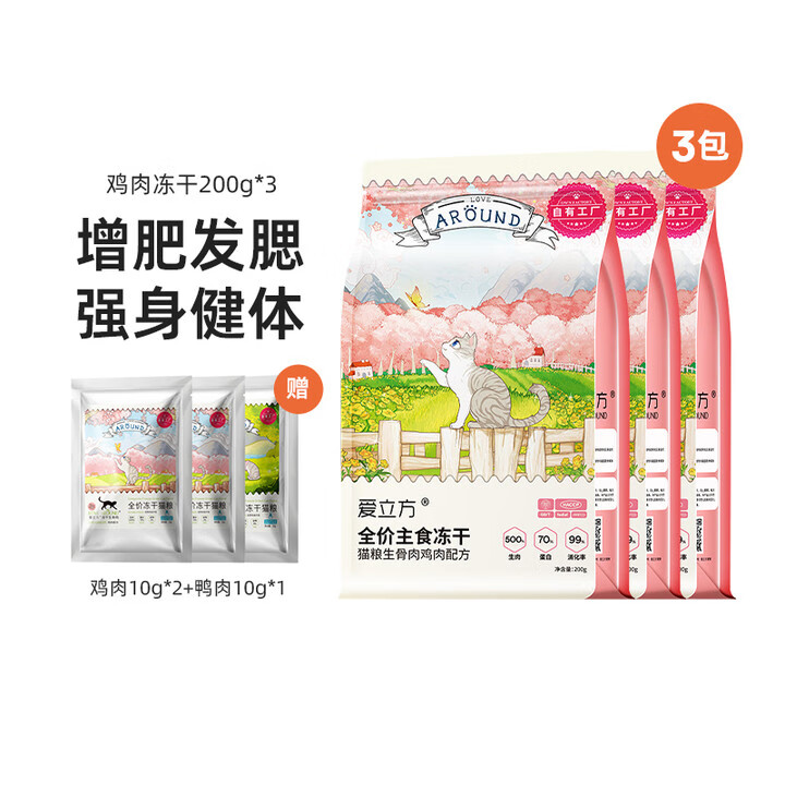 爱立方鸡肉冻干猫粮猫咪生骨肉增肥猫零食增肥发腮猫罐头200g x 3 鸡肉配方 600g 主食生骨肉冻干