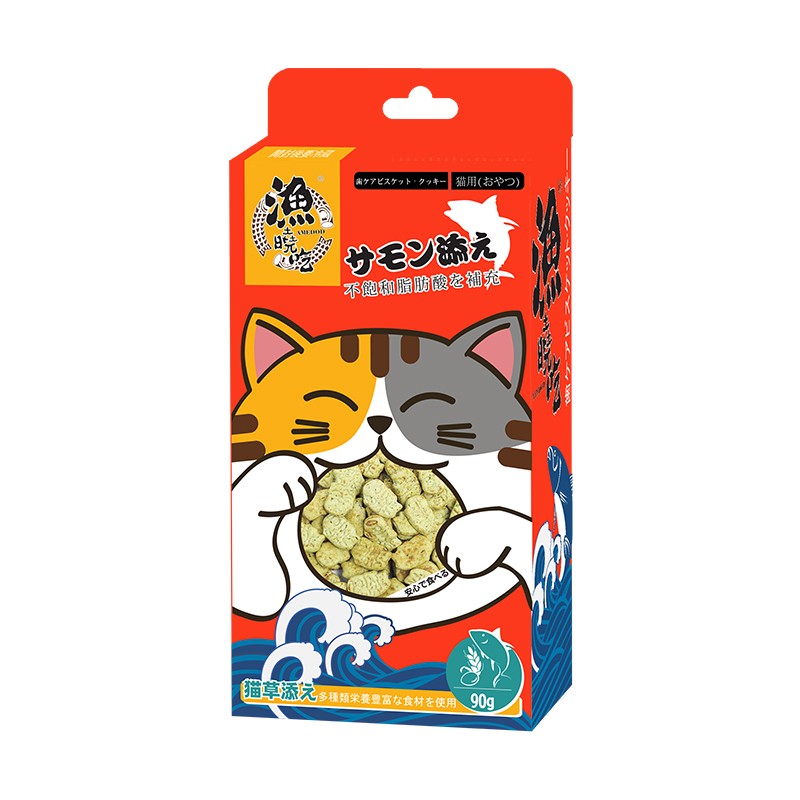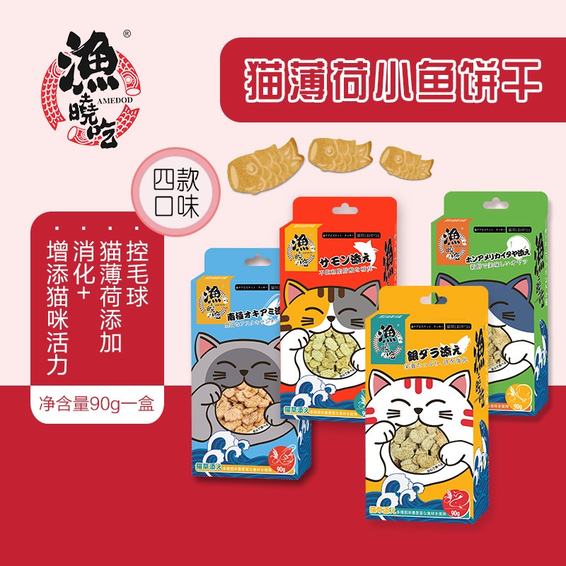渔晓吃猫草薄荷小鱼饼干幼猫成猫宠物零食磨牙洁齿猫零食饼干 90g*4盒 三文鱼味90g*4盒