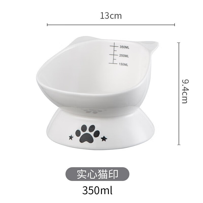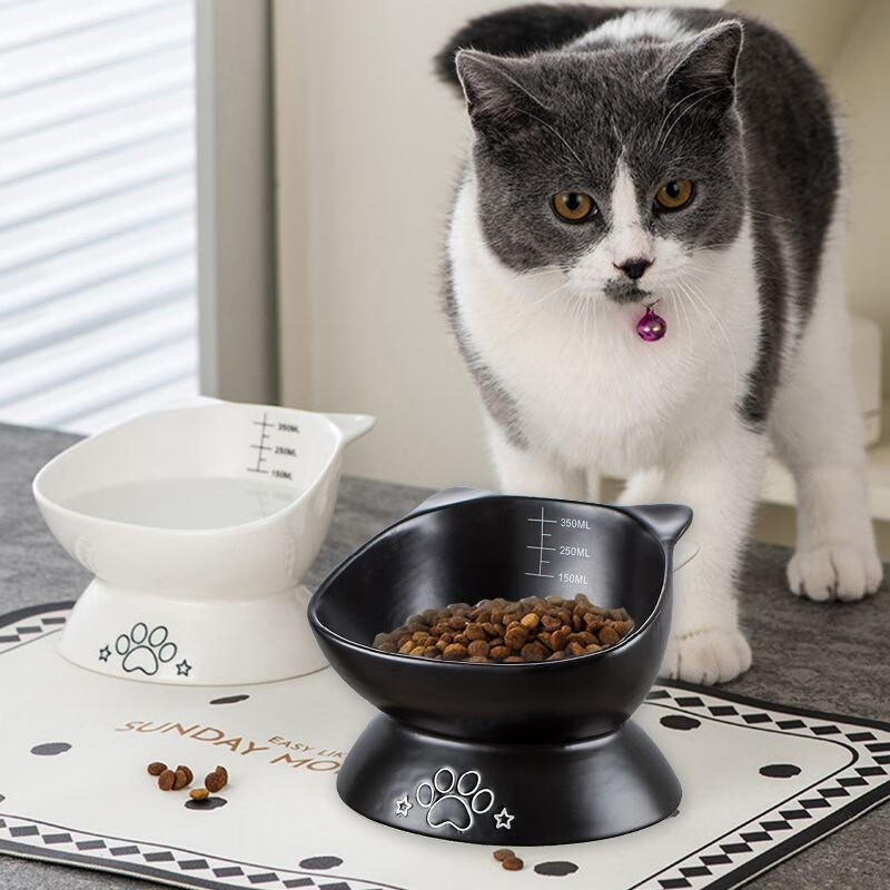 大猫日记猫碗陶瓷双碗猫食盆宠物狗粮碗高脚斜口护颈防打翻猫咪黑色喝水碗 白 黑双碗 (粮350ml/水150ml)