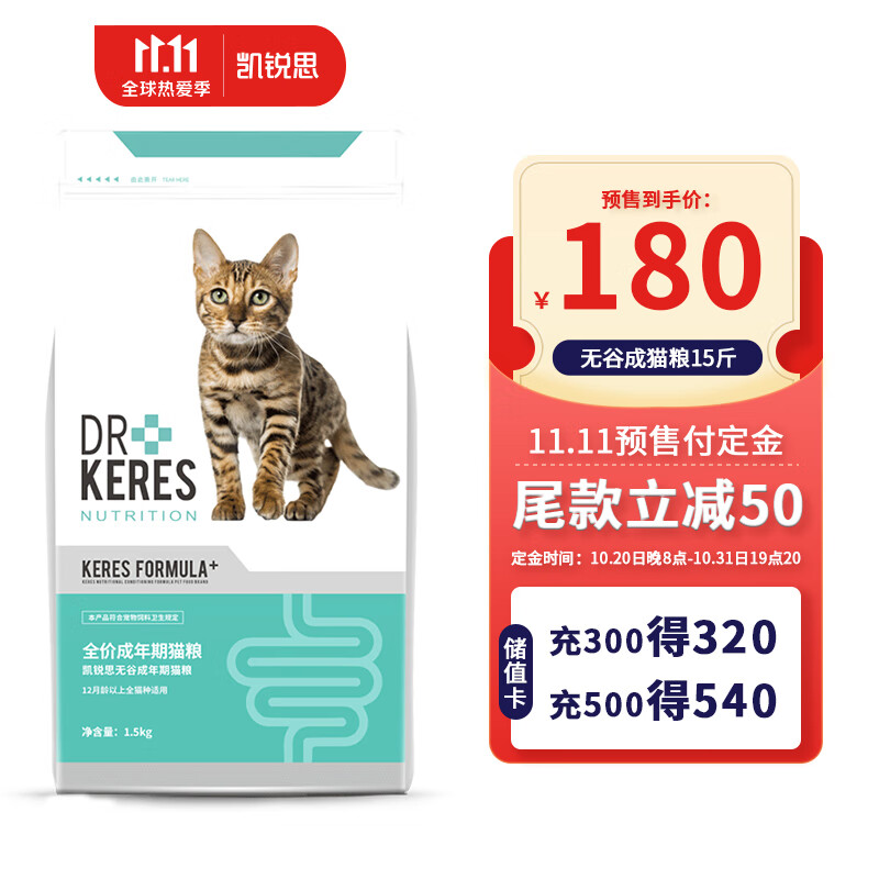 凯锐思 无谷低敏猫粮成猫猫粮肠胃呵护32%粗蛋白 1.5kg*5袋(实发15斤)