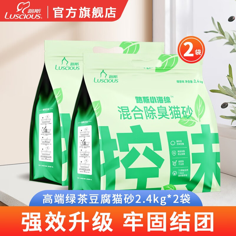 路斯小海绵混合除臭猫砂豆腐猫砂低尘可冲马桶猫咪用品 绿茶味2.4kg*2包