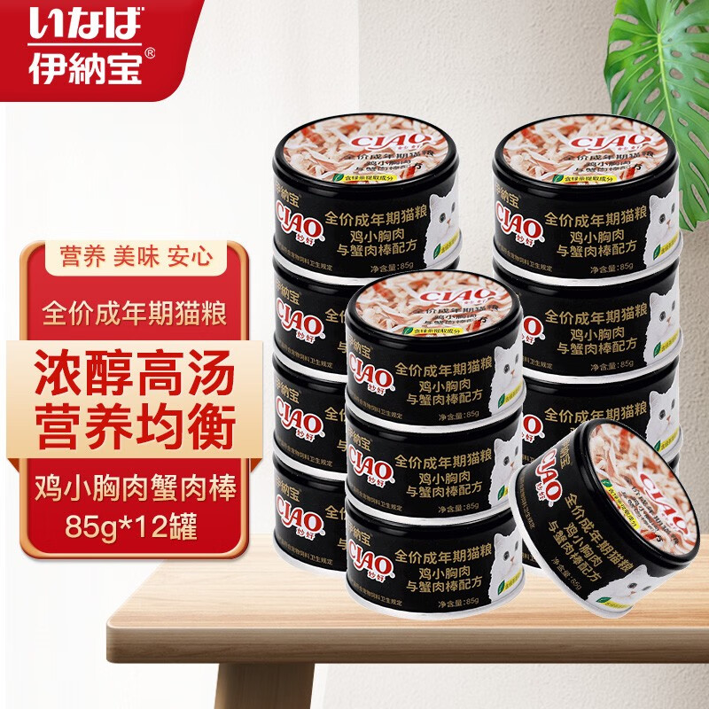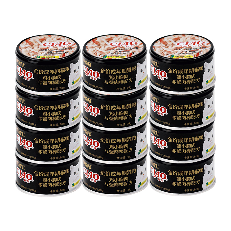 伊纳宝妙好猫罐头 全价成年期猫粮 多种口味猫湿粮汤汁罐 鸡小胸肉蟹肉棒85g*12罐