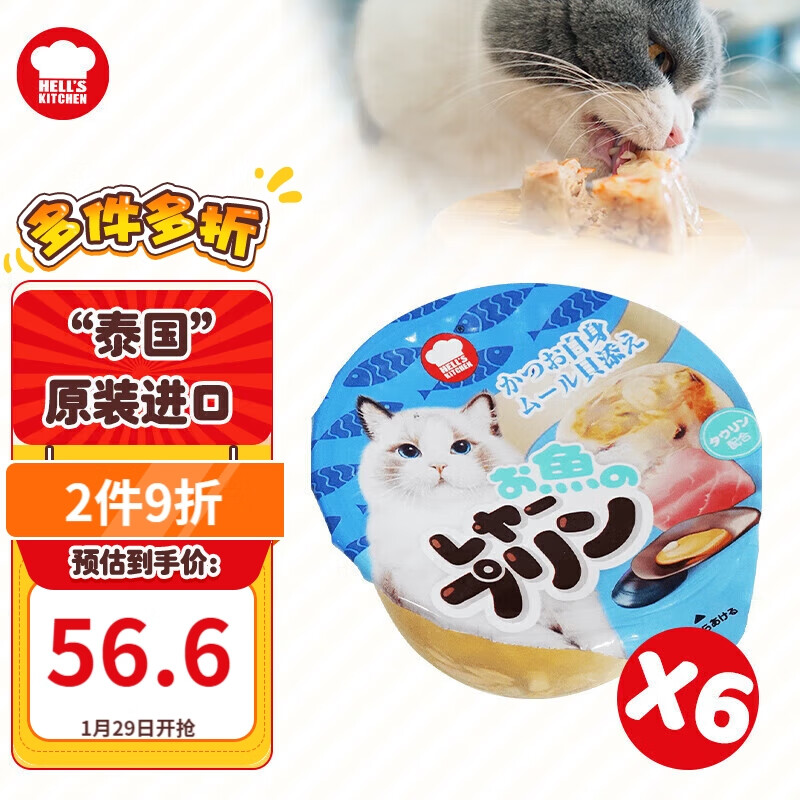 地狱厨房(Hell's Kitchen)成幼猫咪湿粮 增肥营养猫零食罐头 泰国进口塔塔杯 鲣鱼青口贝 80g*6个
