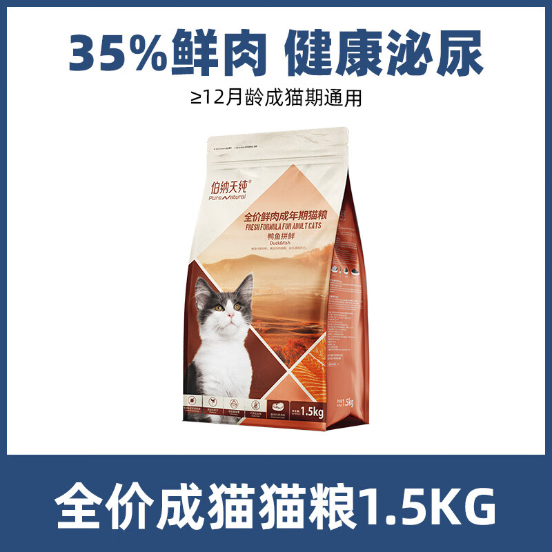 伯纳天纯鲜肉成猫专用猫粮鸭拼鲜全价成猫专用祛毛球健康泌尿 成猫专用(鸭肉 肉混合口味) 1. 1.5kg