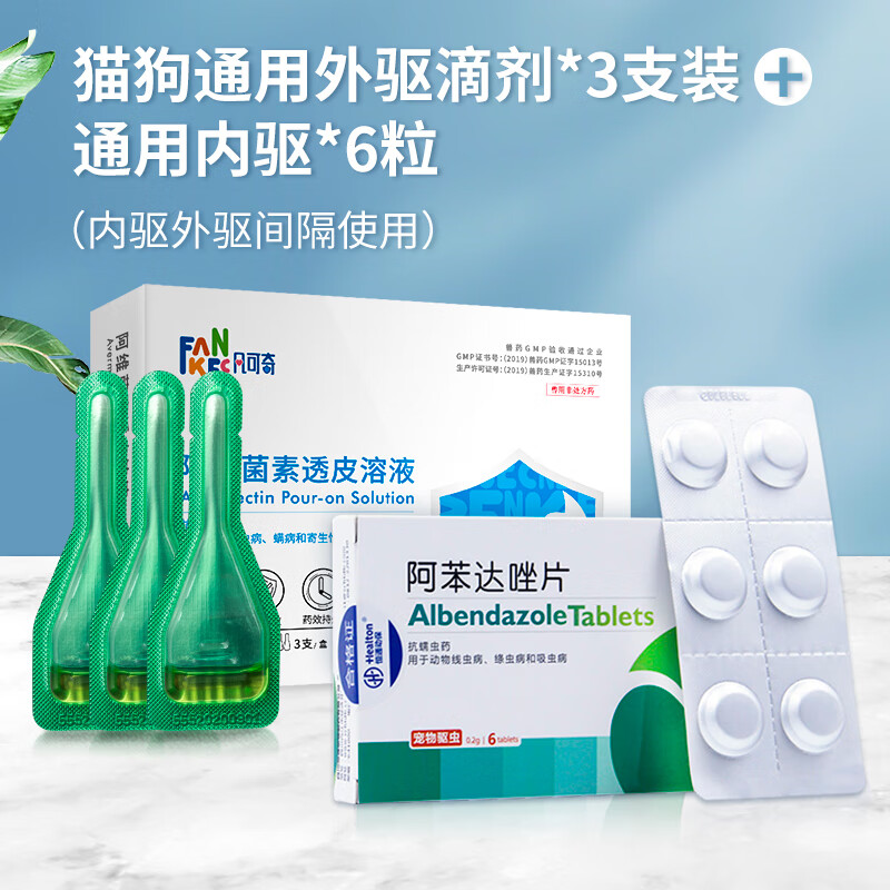 凡可奇 宠物猫咪狗狗驱虫药体外驱虫体内体外同驱阿维菌素透皮溶液滴剂 外驱3支*1盒 内驱6粒
