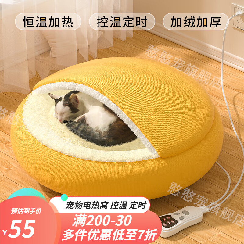 憨憨宠猫窝冬季电热窝狗窝猫床保暖中小型犬电毯垫子半封闭睡袋宠物用品 黄色中号 3档定时调温 12斤内