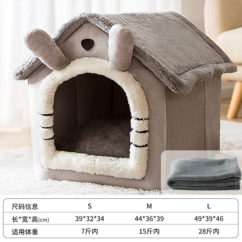 嬉皮狗狗窝房子型冬天保暖小型犬泰迪四季通用可拆洗猫窝狗屋冬季宠物床 长耳灰猫(搭配毛毯) 小型-适合7斤内宠物