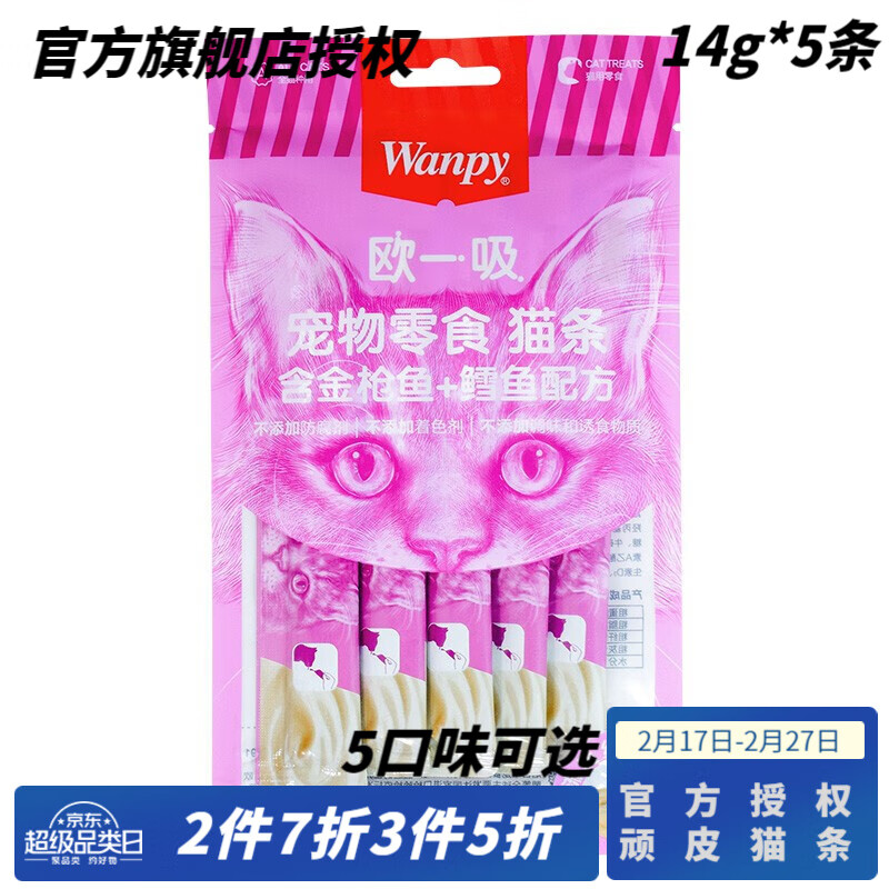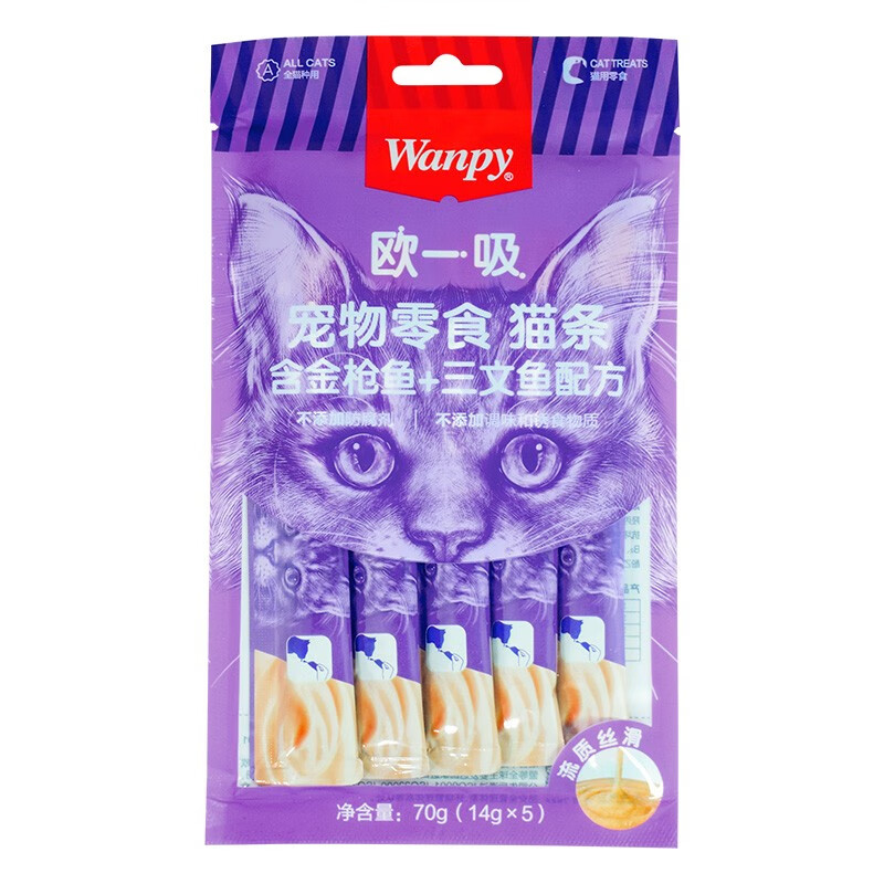 顽皮(Wanpy)猫条湿粮猫咪零食欧一吸成猫幼猫鲜封包猫咪增肥罐头14g*5条袋装 70g金枪鱼 鳕鱼味14g*5条/袋