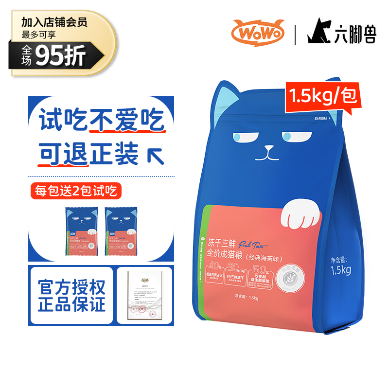 WOWO喔喔猫粮 冻干三鲜胃肠呵护全价成猫粮3种冻干4种肉专治挑嘴 海苔味1.5kg赠100g