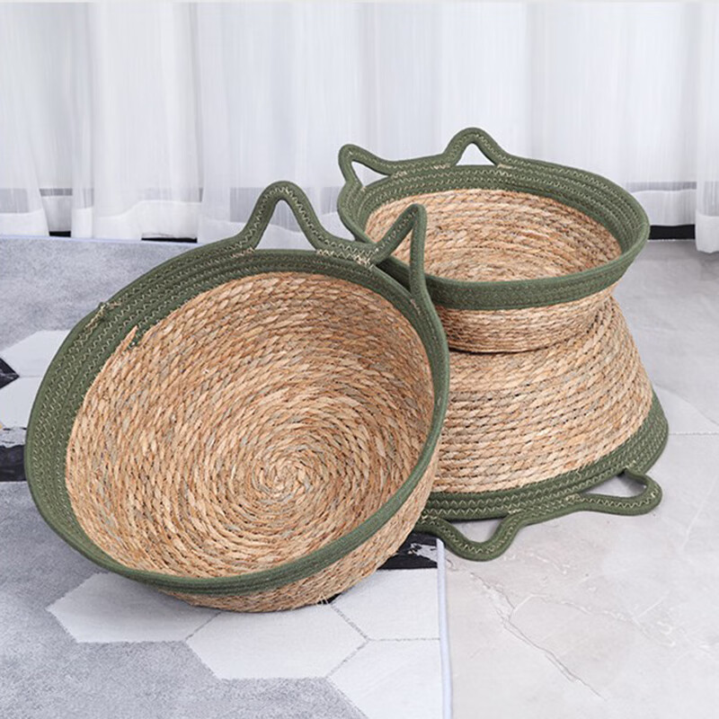 大猫日记 藤编猫窝夏季四季通用编织猫咪窝保暖狗窝垫子草编猫床宠物窝凉席 军绿猫耳棉绳款 中号(适用15斤内宠物)