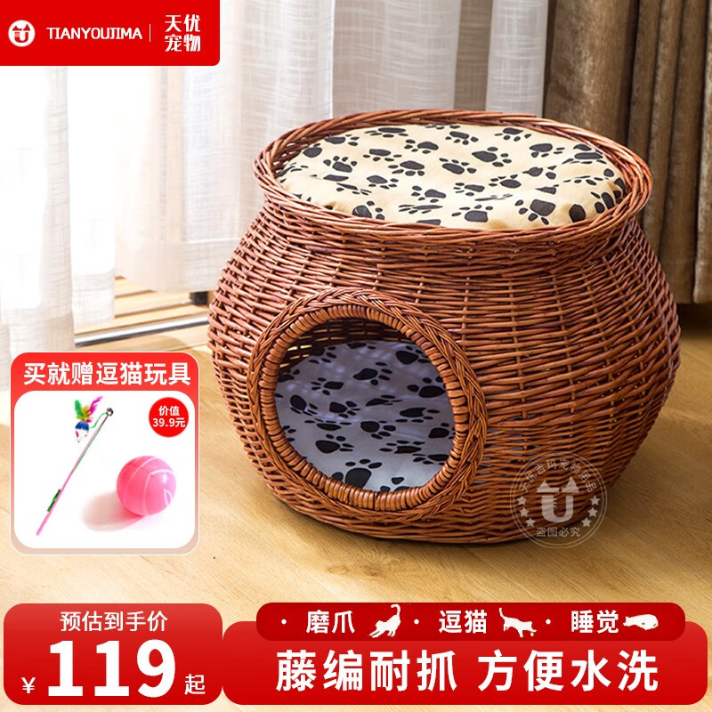 王太医藤编猫窝狗窝夏季凉窝柳编猫舍猫屋猫房子小型犬窝四季通用可拆洗 红棕色 M中型35*41(建议12斤以内) 单窝 2个凉席