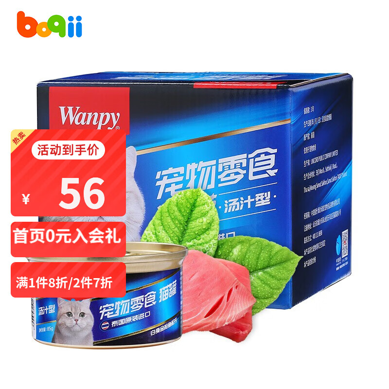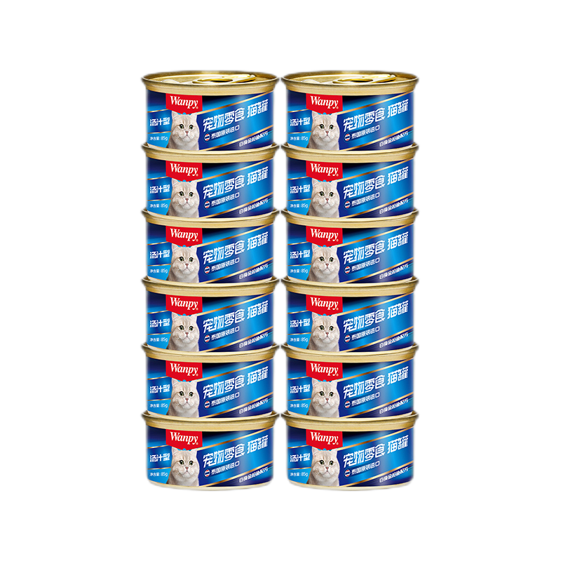 顽皮(Wanpy)猫零食 泰国进口猫罐头 成幼猫宠物猫咪零食罐头湿粮 汤汁型白身金枪鱼配方85g*12