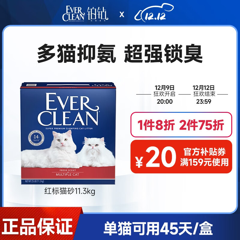 铂钻(EverClean)铂钻原装进口猫砂膨润土无尘 活性炭除臭猫砂25磅 红标抑氨11.3kg 现货