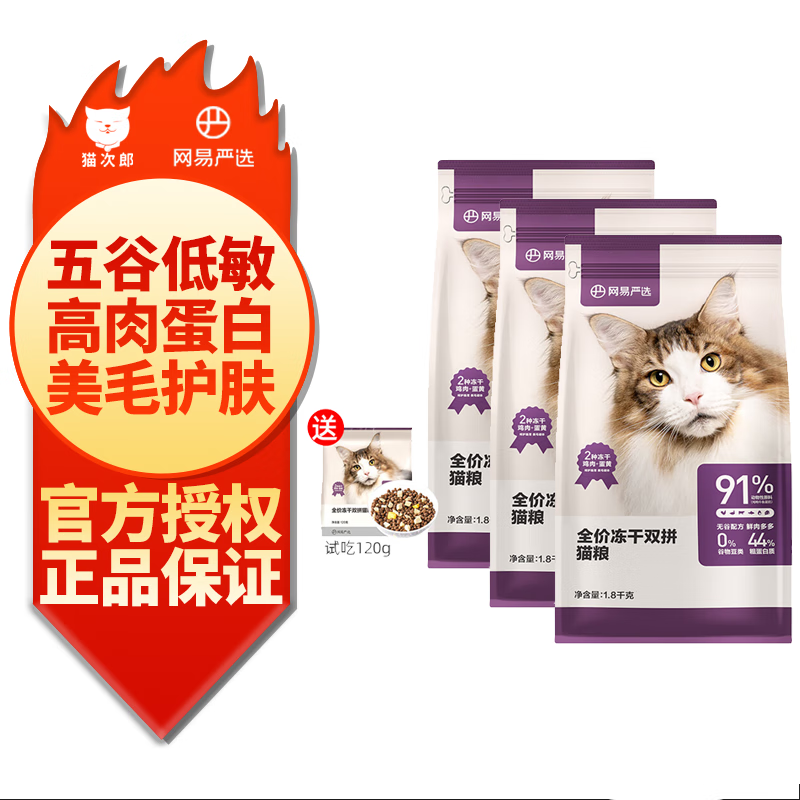 网易严选全价冻干双拼猫粮宠物主粮全价天然无谷粮1.8kg 【活动】1.8kg*3包 试吃120g