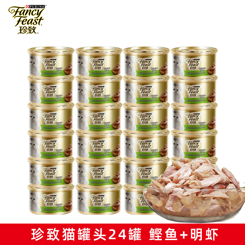 珍致(FancyFeast)猫罐头白肉泰国进口猫湿粮 宠物成幼猫金枪鱼猫零食营养食品 精选鲣鱼肉 明虾24罐【肉冻】
