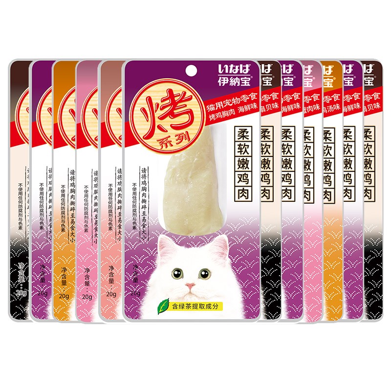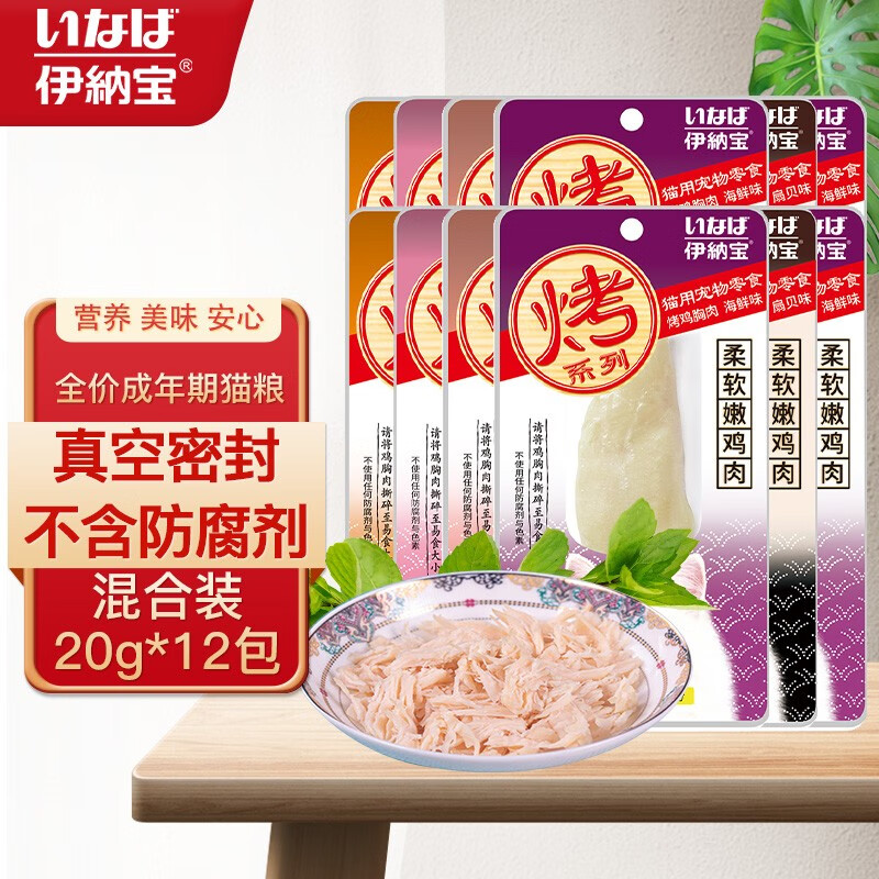 伊纳宝猫用宠物零食 烤鸡胸肉整块 成猫零食烧烤系列多口味新鲜鸡肉干 混合装20g*12包