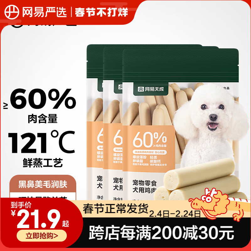 网易严选 鸡肉火腿肠 宠物食品幼犬成犬营养零食 柯基柴犬泰迪博美贵宾犬 180克*3袋