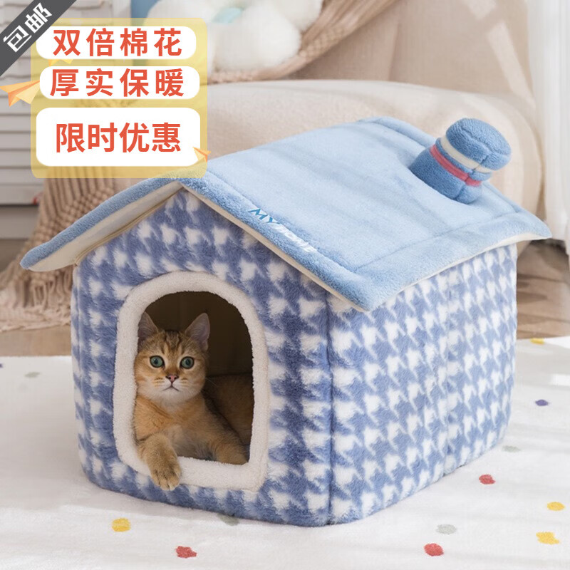 沄筱猫窝狗窝冬季保暖加大加厚可拆洗宠物窝狗房子保暖舒适屋小型犬床 蓝色格子窝M【48*40*40 15斤内】
