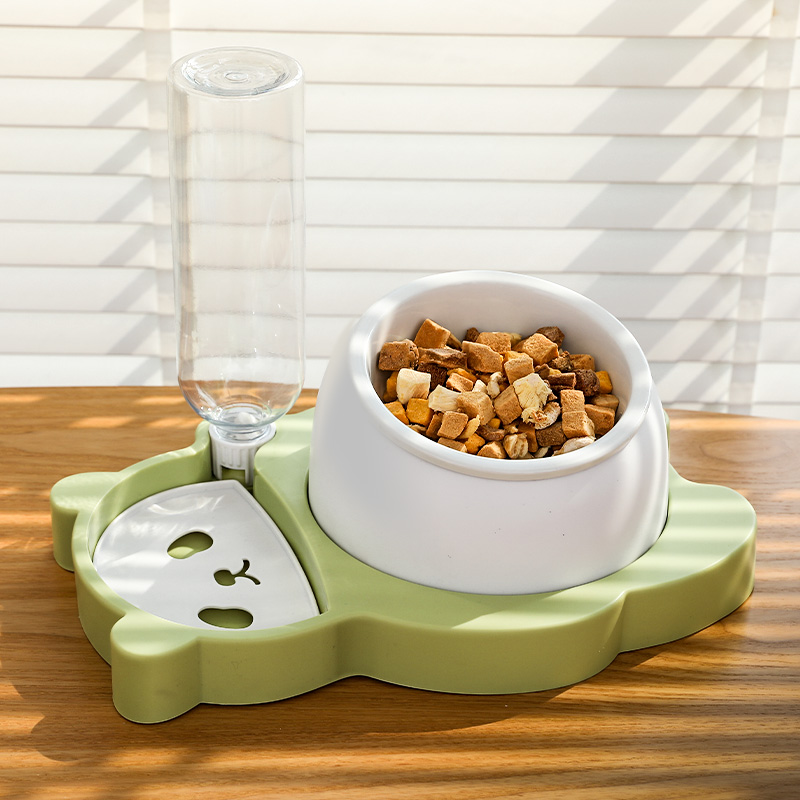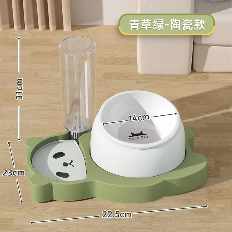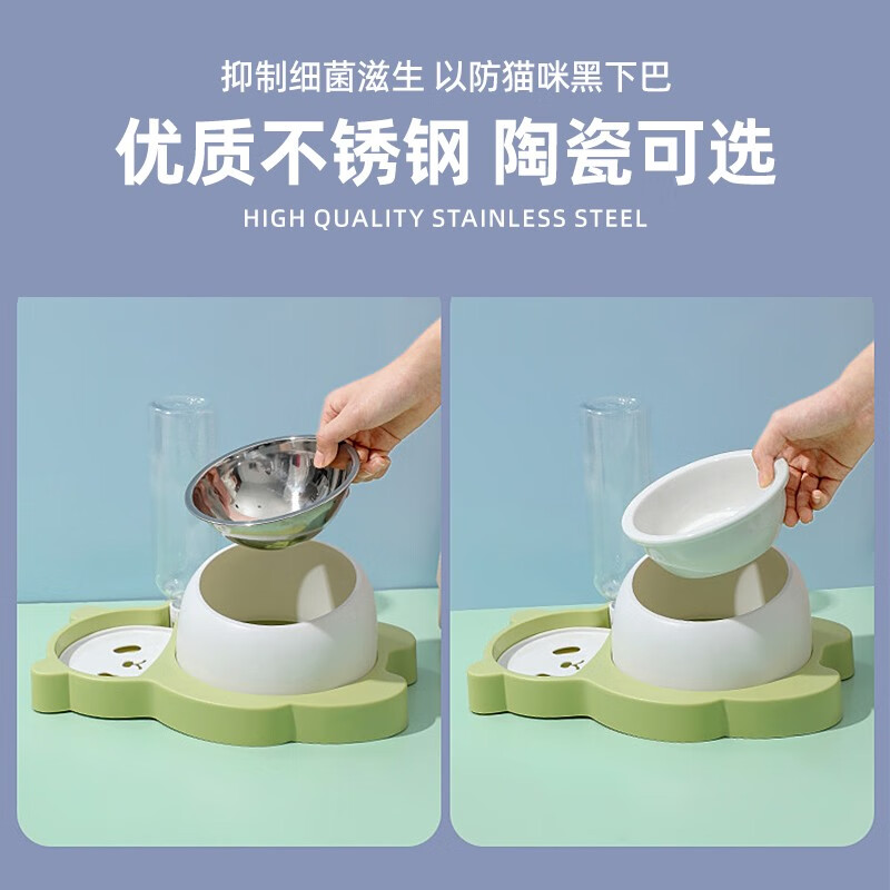hoopet猫碗陶瓷猫咪饮水机狗猫食盆猫碗高脚护颈不锈钢自动续水猫粮碗大容量防打翻猫水机宠物双碗喂食 青草绿(陶瓷款)
