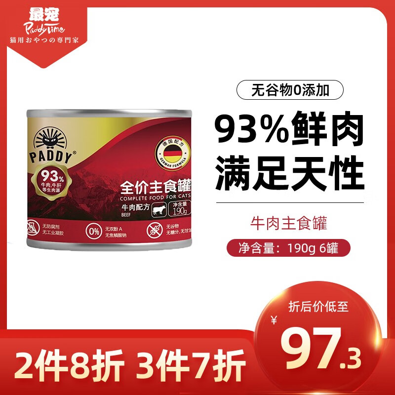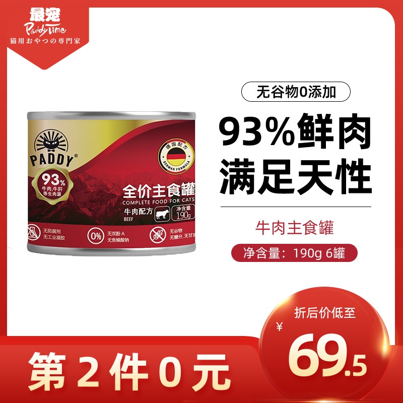 澳洲品牌 最宠(Paddy Time)猫湿粮 猫咪罐头全价无谷主食级湿粮软包成猫幼猫通用猫咪主食罐头 最宠主食猫罐-牛肉190g*6罐