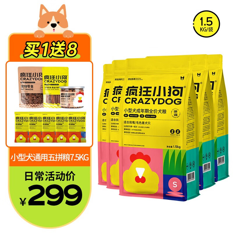 疯狂小狗 拼派冻干狗粮宠物泰迪贵宾比熊博美柯基小型犬幼犬粮成犬粮 冻干五拼粮7.5kg【靓丽毛发】