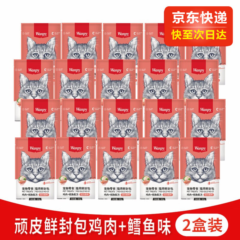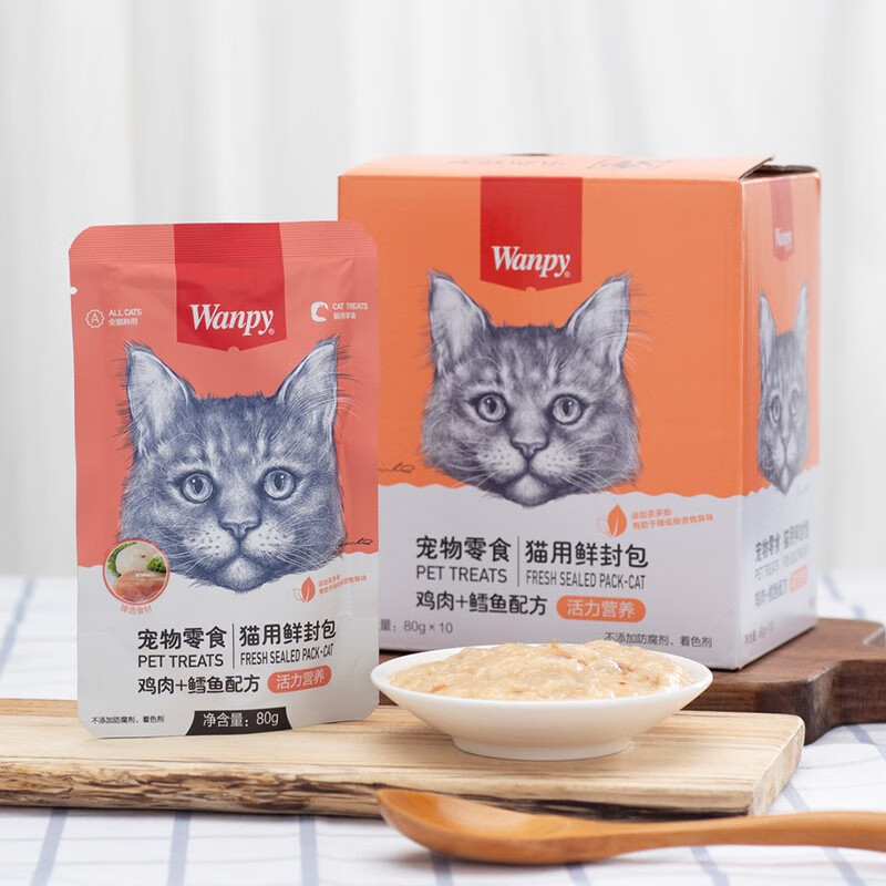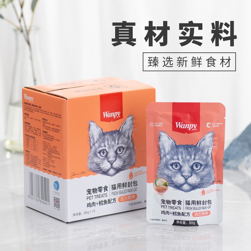 顽皮(Wanpy)猫咪鲜封包 宠物猫粮肉粒包 猫湿粮猫罐头整盒装 鸡肉 鳕鱼80g*10袋(2盒装)