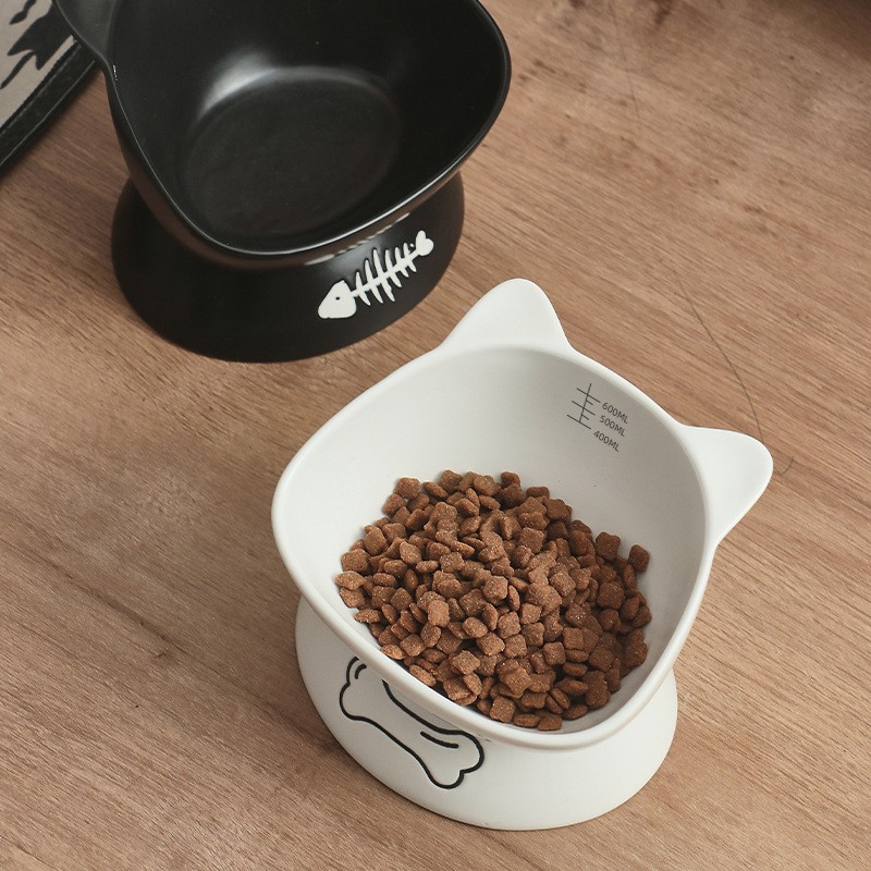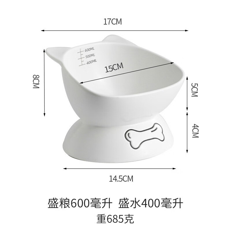 大猫日记猫碗陶瓷双碗猫食盆宠物狗粮碗高脚斜口护颈防打翻猫咪黑色喝水碗 白色大号(粮600ml/水400ml)