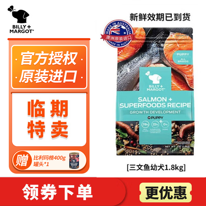 比利玛格(BILLY MARGOT)宠物狗粮澳洲进口全价犬粮无谷低敏通用金毛泰迪狗狗主粮 三文鱼幼犬1.8kg