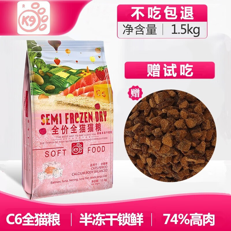 K9猫粮原味半冻干软粮 无谷猫主粮鱼肉幼猫粮孕猫成猫粮 宠物主粮全猫期通用呵护肠道亮毛发猫粮 C6全猫粮通用全价1.5kg