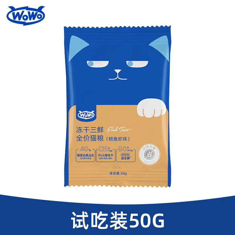 喔喔(WOWO)猫粮 经典鳕鱼虾味 冻干三鲜无谷猫粮宠物全价猫干粮 【经典鳕鱼虾】50g