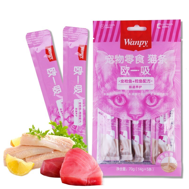 顽皮(Wanpy)猫条猫咪零食欧一吸全阶段湿粮包猫咪流质零食布丁70g*5包 金枪鱼 鳕鱼70g*1包/5条装