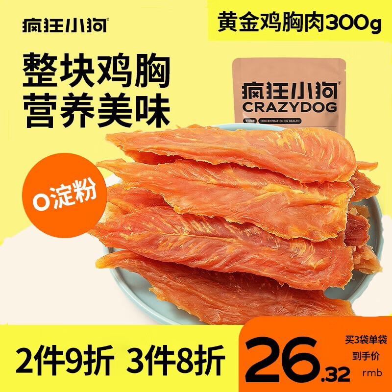 疯狂小狗 狗狗零食肉干条宠物零食泰迪金毛柯基磨牙训犬0淀粉鸡鸭胸肉干 鸡胸肉300g 【整只鸡大胸】 0淀粉0诱食剂