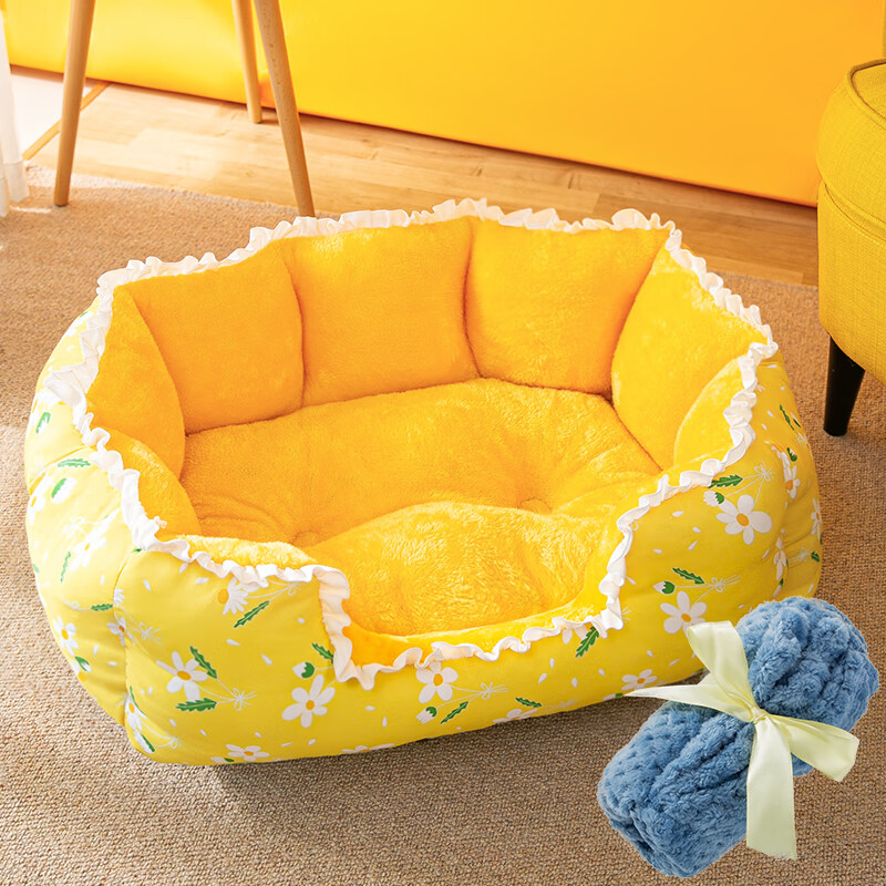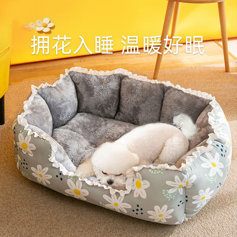 嬉皮狗狗窝四季通用夏天小型犬狗狗床四季通用猫窝非可拆洗泰迪宠物用品 黄色小花加绒(搭配毛毯) 中号-20内(80%用户选择)