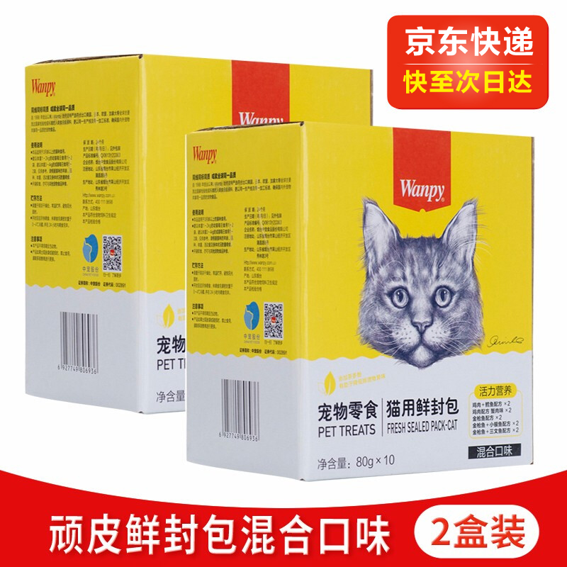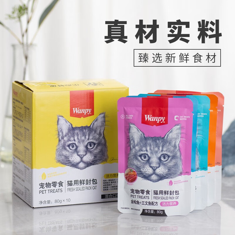 顽皮(Wanpy)猫咪鲜封包 宠物猫粮肉粒包 猫湿粮猫罐头整盒装 混合口味80g*10袋(2盒装)