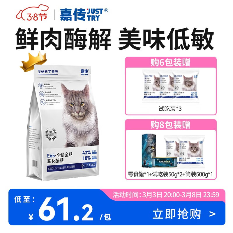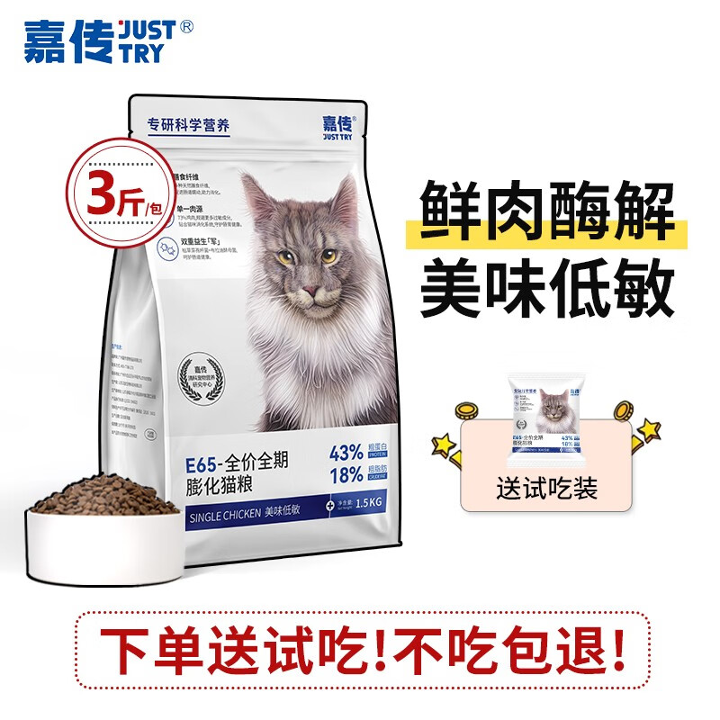 嘉传E65全价无谷鲜肉粮单一鸡肉挑嘴克星成猫幼猫高蛋白低敏发腮猫粮 E65美味低敏膨化猫粮 9kg 6包装 3包试吃