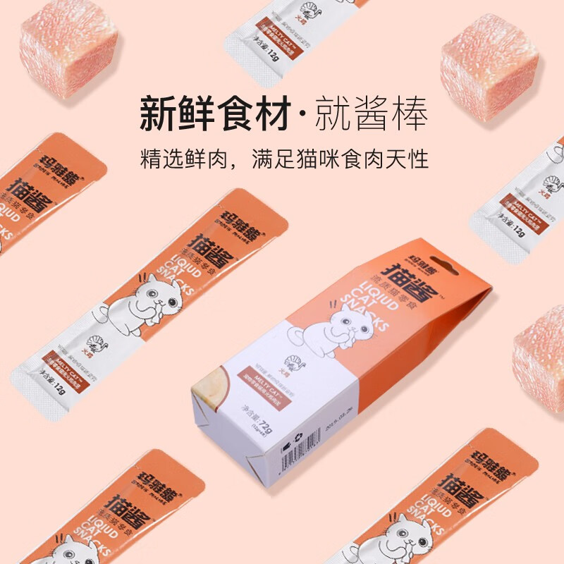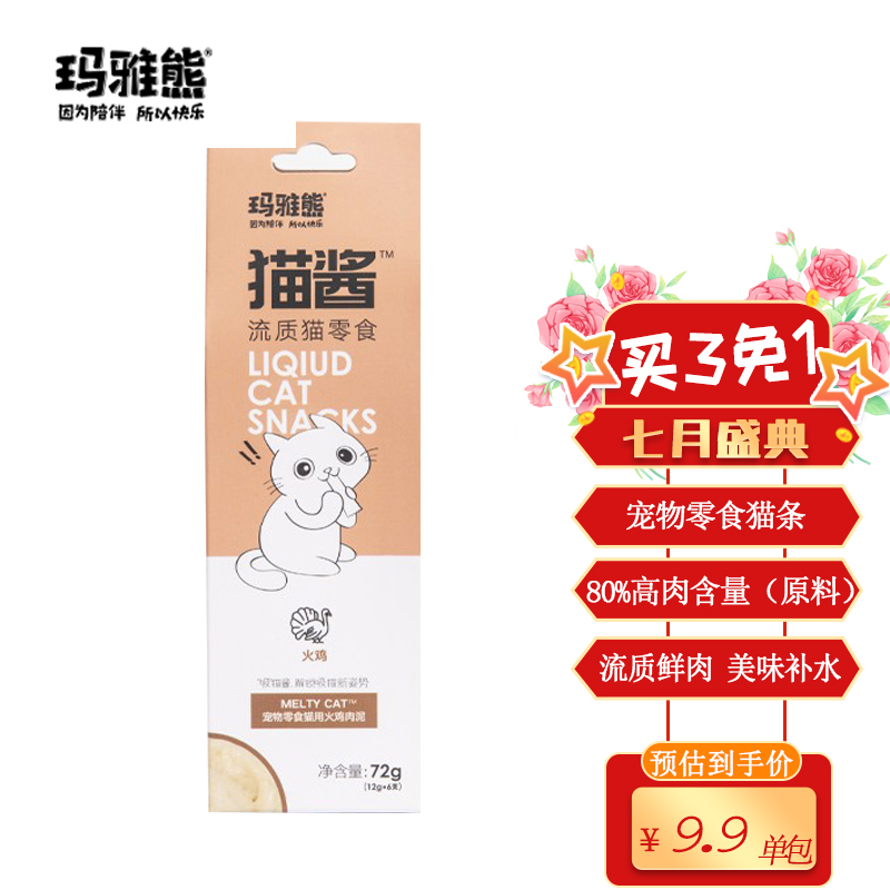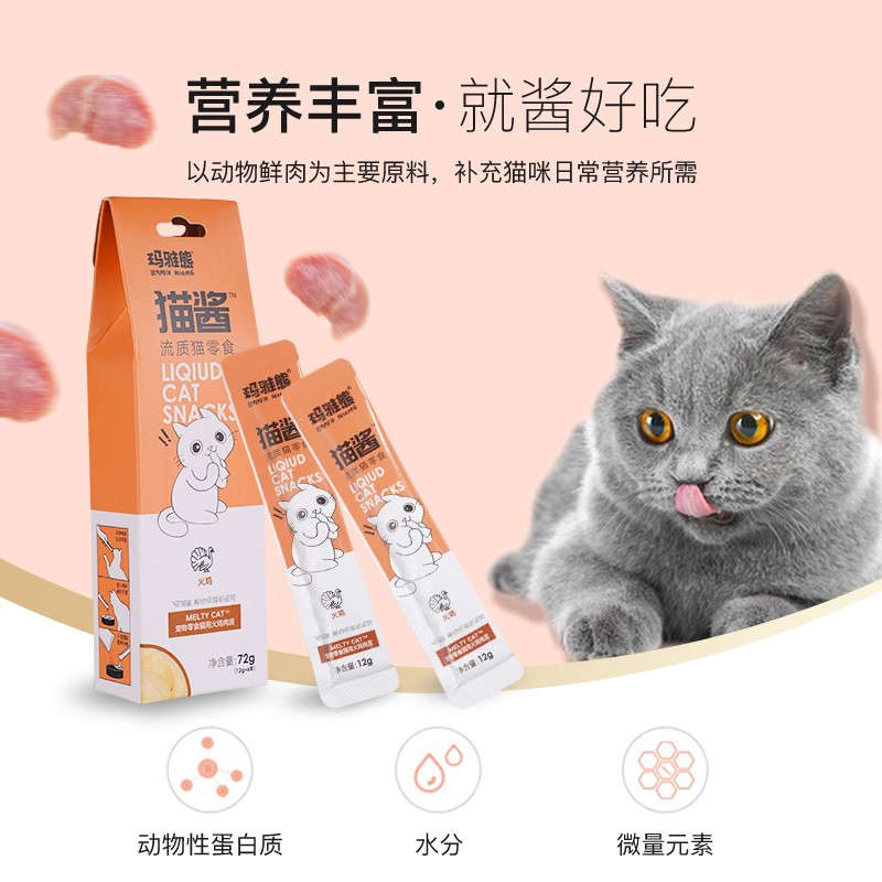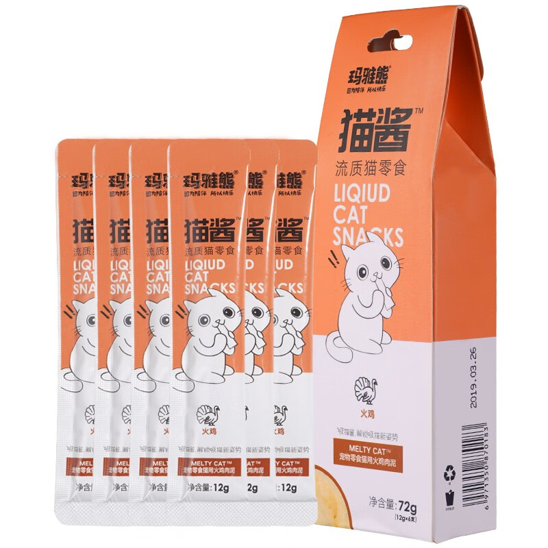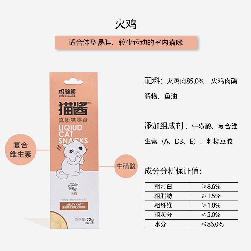 玛雅熊宠物猫零食猫条 火鸡肉泥 成幼猫咪通用营养湿粮软包72g(12g*6支)整盒装