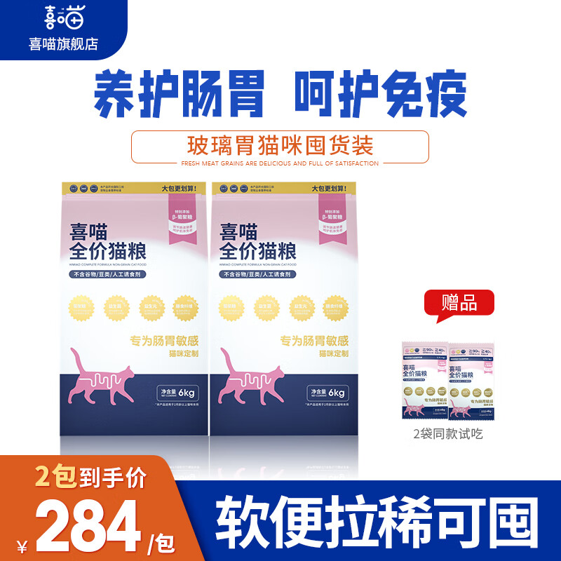 喜喵猫粮成猫幼猫全价无谷通用型猫主粮高蛋白营养增肥猫粮 【玻璃胃专用猫粮】6kg*2包