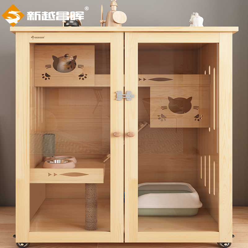新越昌晖猫笼子猫别墅实木清漆猫柜子大号猫窝猫屋猫舍猫房子豪华三层宠物屋透气移动柜子高120*宽120*深60cm