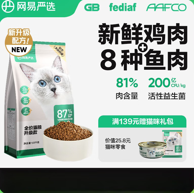 网易严选全期猫粮无谷三文鱼1.8kg鱼肉味成猫幼猫 全价猫粮排行榜 【鱼肉味】81%肉含量(9种肉) 1800g单包装