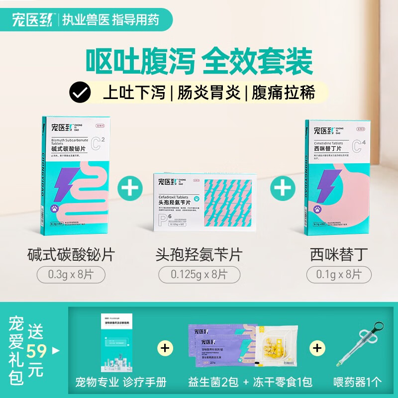 【七仓直发】宠医到 宠物止吐药肠胃药狗狗猫咪止痛止泻西咪替丁片 呕吐腹泻炎症吐黄水白沫胃酸含益生菌 西咪替丁 头孢羟氨苄片 碱式碳酸铋(上吐下泻)
