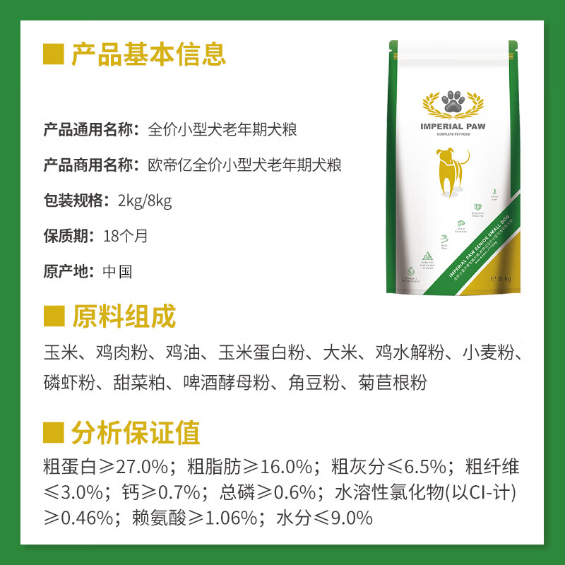 欧帝亿(IMPERIAL PAW)小型犬老龄犬狗粮全价老年期犬粮老狗8kg贵宾泰迪比熊通用博美
