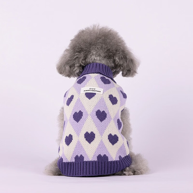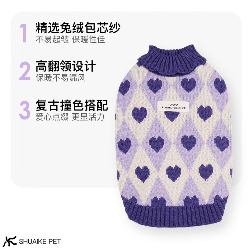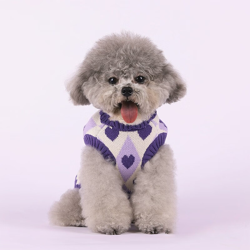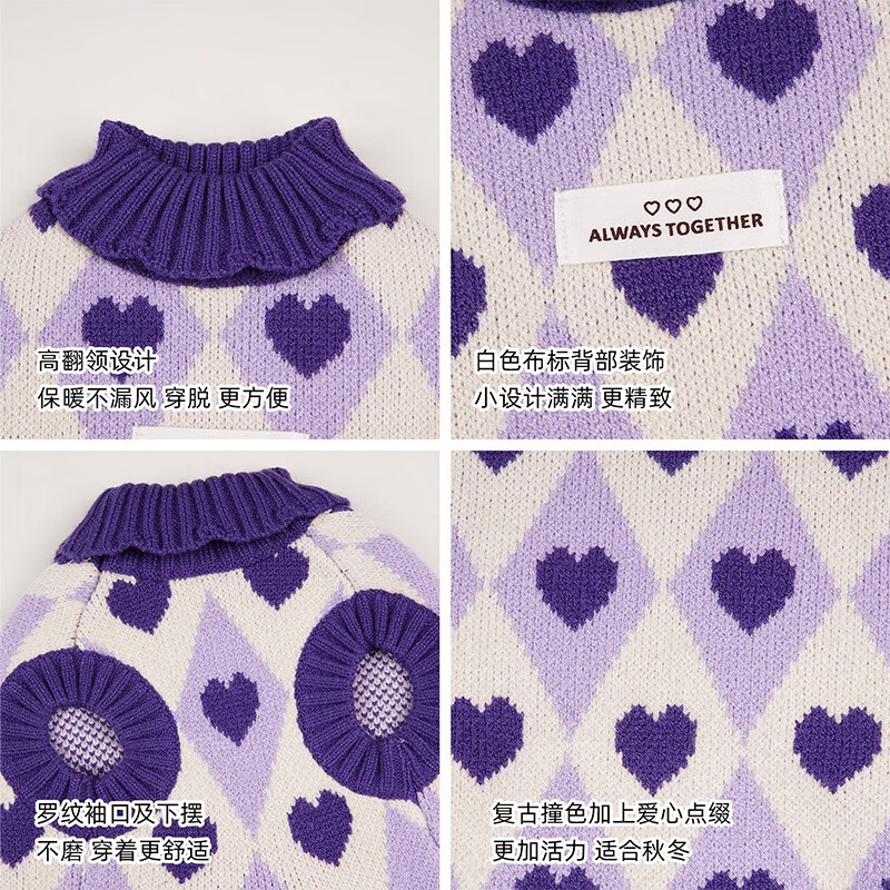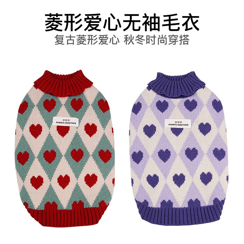爵士狼宠物毛衣猫咪爱心无袖毛衣加厚保暖狗狗衣服秋冬弹力翻领针织毛衣 复古撞色爱心【紫色】 L码建议7-10斤