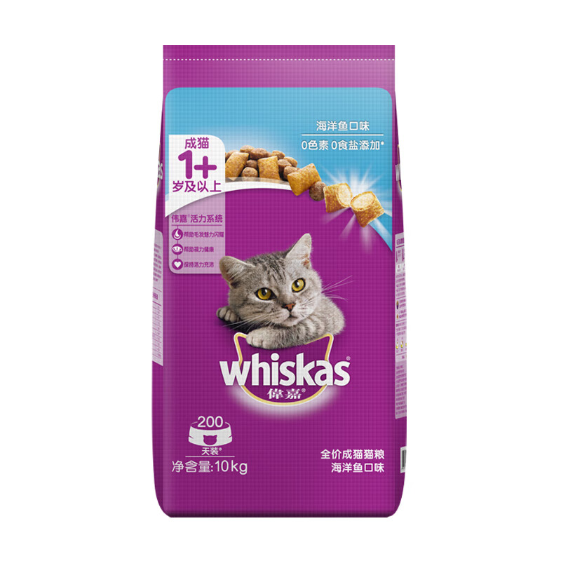 伟嘉(whiskas)猫粮海洋牛肉成猫粮营养增肥发腮全价猫咪主粮10kg 成猫猫粮海洋口味 7.2k.g 实发3.6k.g*2.袋